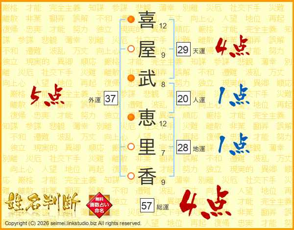 喜(12画)屋(9画)武(8画) 恵(12画)里(7画)香(9画)