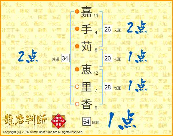 嘉(14画)手(4画)苅(8画) 恵(12画)里(7画)香(9画)
