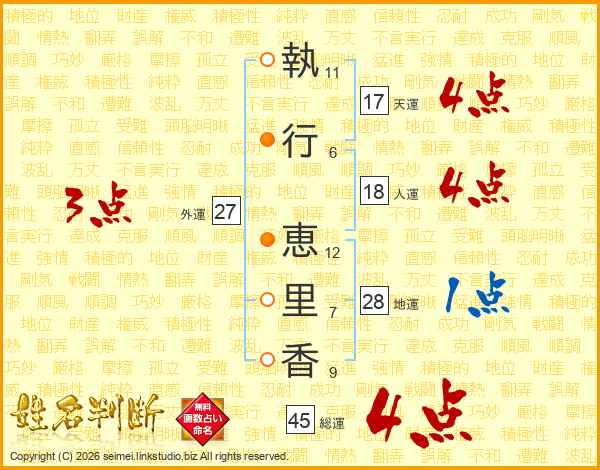 執(11画)行(6画) 恵(12画)里(7画)香(9画)