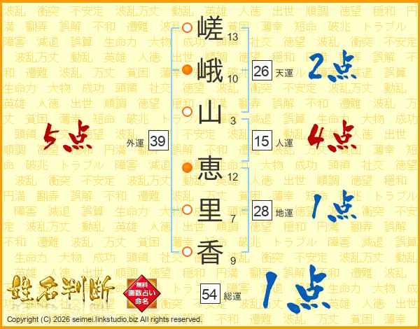 嵯(13画)峨(10画)山(3画) 恵(12画)里(7画)香(9画)