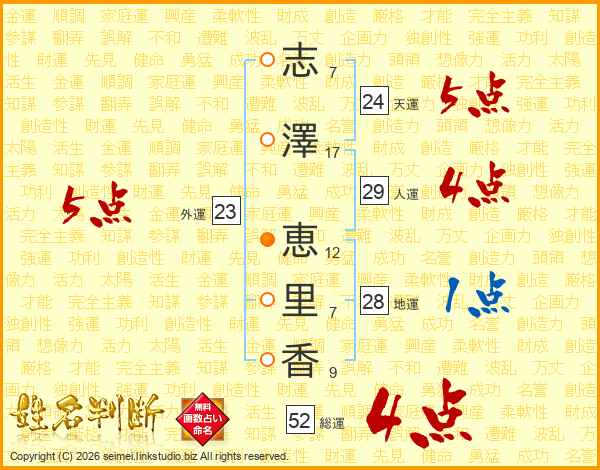 志(7画)澤(17画) 恵(12画)里(7画)香(9画)