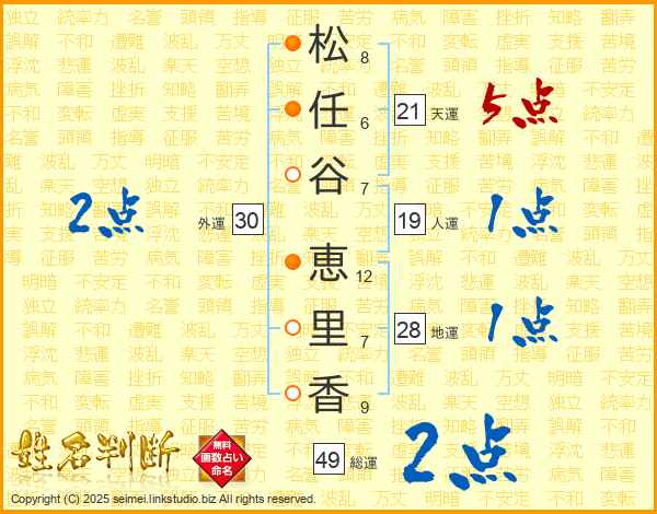 松(8画)任(6画)谷(7画) 恵(12画)里(7画)香(9画)