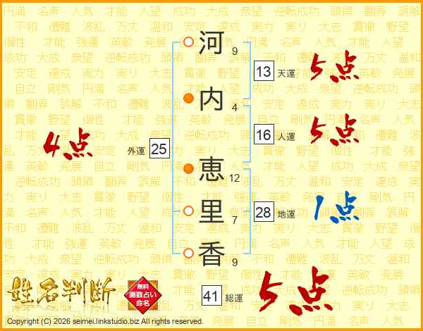 河(9画)内(4画) 恵(12画)里(7画)香(9画)