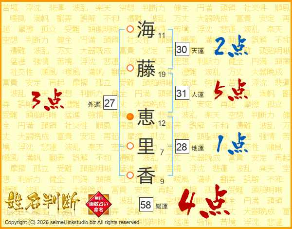 海(11画)藤(19画) 恵(12画)里(7画)香(9画)