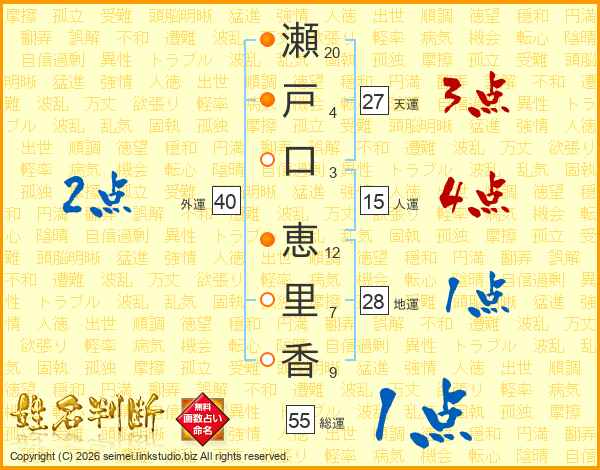 瀬(20画)戸(4画)口(3画) 恵(12画)里(7画)香(9画)