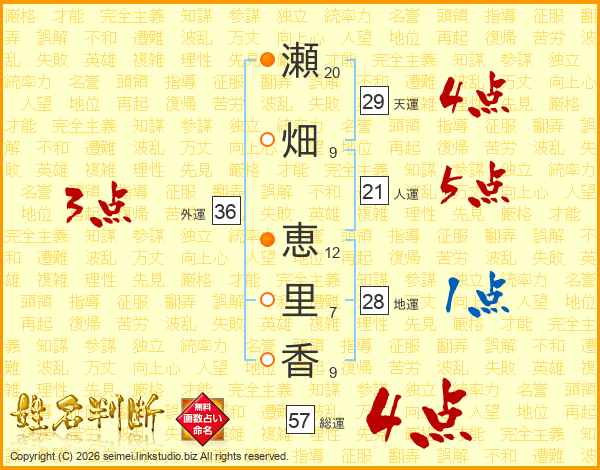 瀬(20画)畑(9画) 恵(12画)里(7画)香(9画)