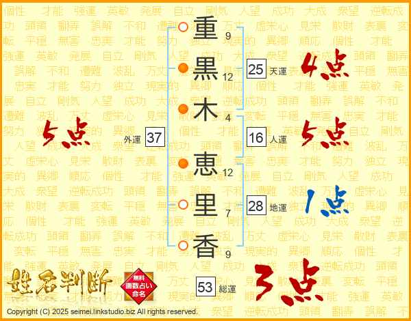 重(9画)黒(12画)木(4画) 恵(12画)里(7画)香(9画)
