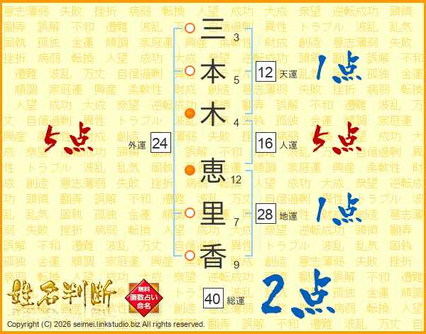 三(3画)本(5画)木(4画) 恵(12画)里(7画)香(9画)