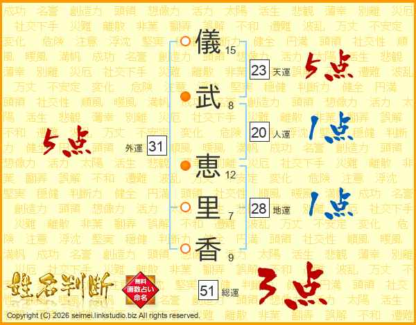 儀(15画)武(8画) 恵(12画)里(7画)香(9画)