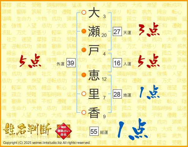 大(3画)瀬(20画)戸(4画) 恵(12画)里(7画)香(9画)