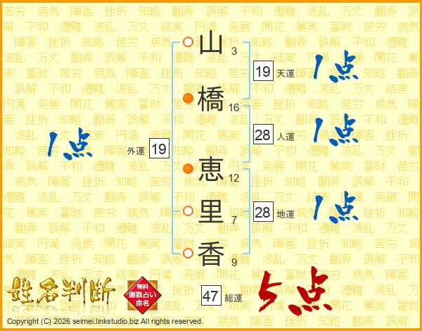 山(3画)橋(16画) 恵(12画)里(7画)香(9画)