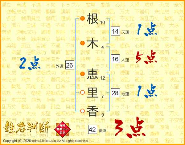 根(10画)木(4画) 恵(12画)里(7画)香(9画)