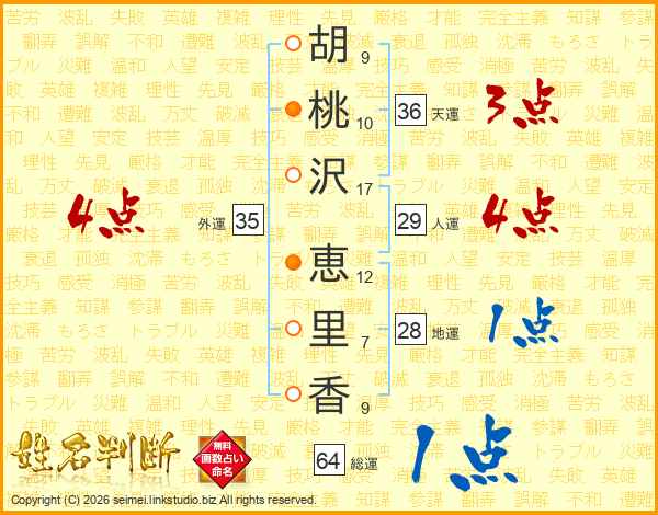 胡(9画)桃(10画)沢(17画) 恵(12画)里(7画)香(9画)