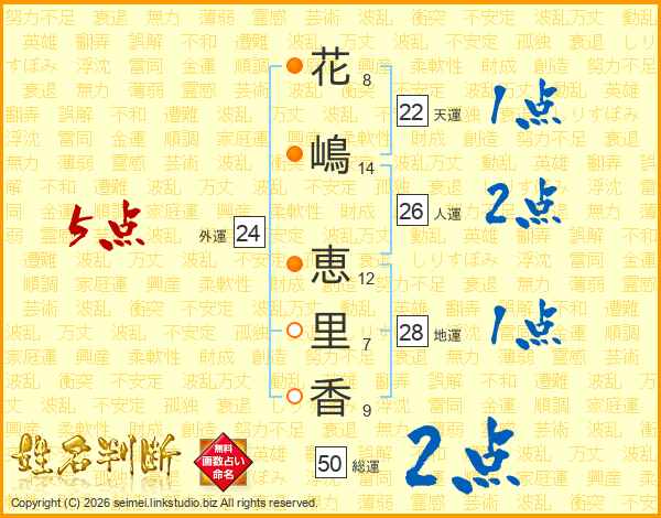 花(8画)嶋(14画) 恵(12画)里(7画)香(9画)