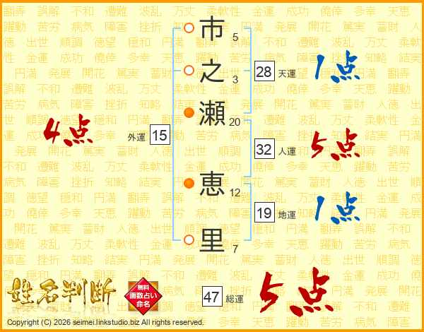 市(5画)之(3画)瀬(20画) 恵(12画)里(7画)
