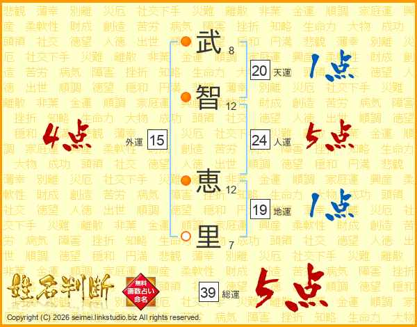 生活面を象徴する運勢です。外部から受ける影響力を表し、結婚運、家庭運や職場、環境への順応性を表します。総運から人運を引いた画数。姓や名が1文字の場合を除く。