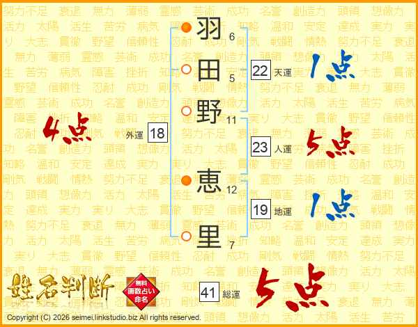 羽(6画)田(5画)野(11画) 恵(12画)里(7画)