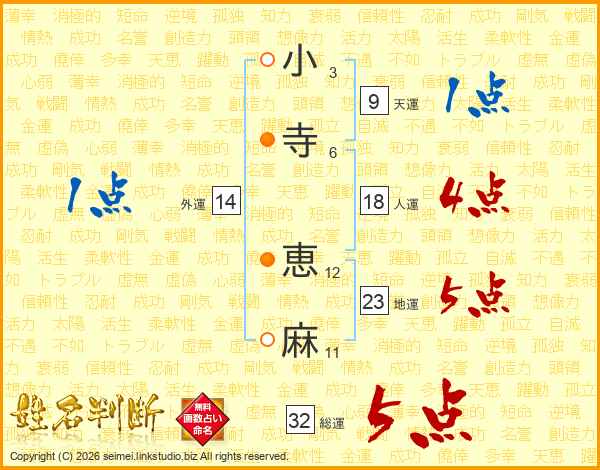 小(3画)寺(6画) 恵(12画)麻(11画)