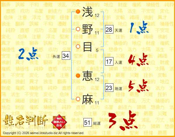 浅(12画)野(11画)目(5画) 恵(12画)麻(11画)