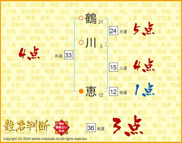 鶴(21画)川(3画) 恵(12画)