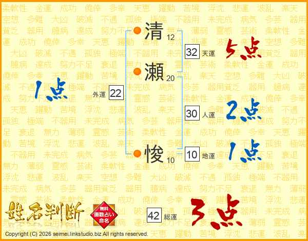 生活面を象徴する運勢です。外部から受ける影響力を表し、結婚運、家庭運や職場、環境への順応性を表します。総運から人運を引いた画数。姓や名が1文字の場合を除く。
