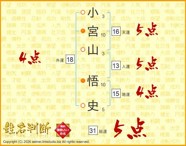小宮山悟史さんの総運は31画の5点!