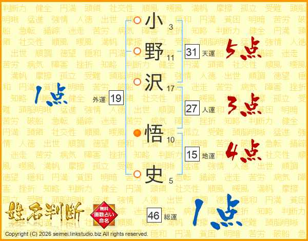 小(3画)野(11画)沢(17画) 悟(10画)史(5画)