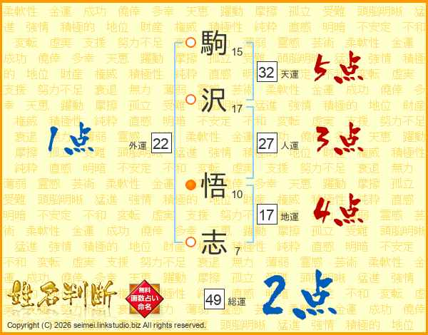 駒(15画)沢(17画) 悟(10画)志(7画)