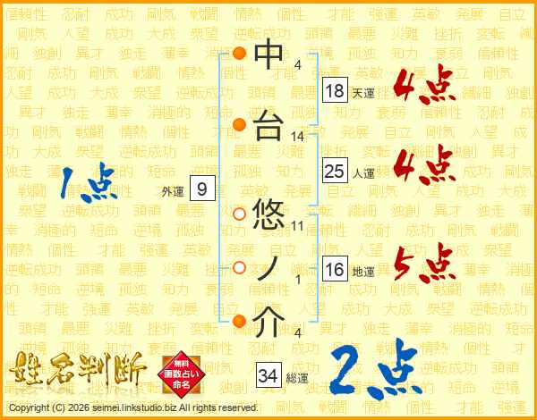 中(4画)台(14画) 悠(11画)ノ(1画)介(4画)