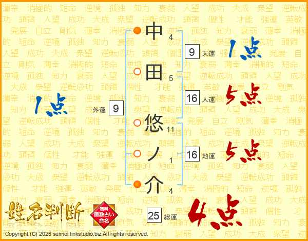 中田悠ノ介さんの総運は25画の4点!