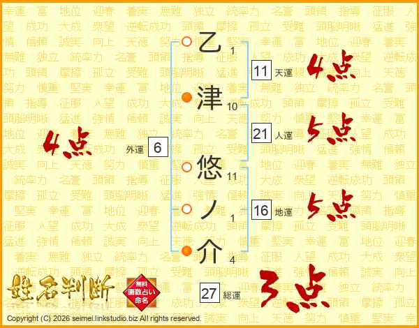 乙(1画)津(10画) 悠(11画)ノ(1画)介(4画)