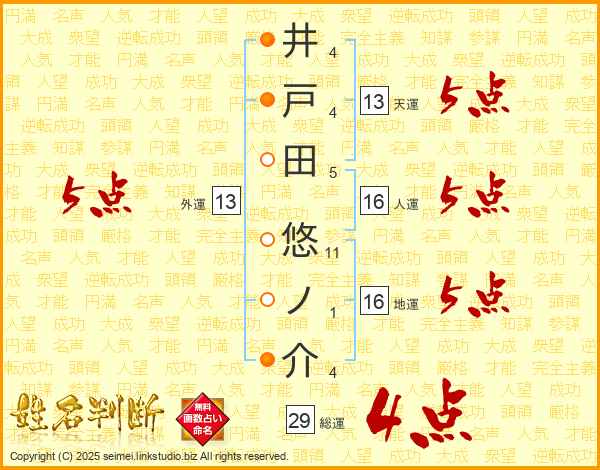 井(4画)戸(4画)田(5画) 悠(11画)ノ(1画)介(4画)