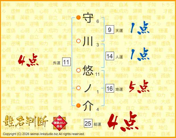 守(6画)川(3画) 悠(11画)ノ(1画)介(4画)