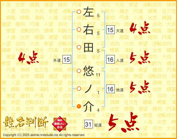 左(5画)右(5画)田(5画) 悠(11画)ノ(1画)介(4画)