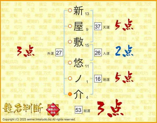 新(13画)屋(9画)敷(15画) 悠(11画)ノ(1画)介(4画)