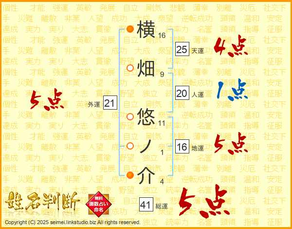 生活面を象徴する運勢です。外部から受ける影響力を表し、結婚運、家庭運や職場、環境への順応性を表します。総運から人運を引いた画数。姓や名が1文字の場合を除く。