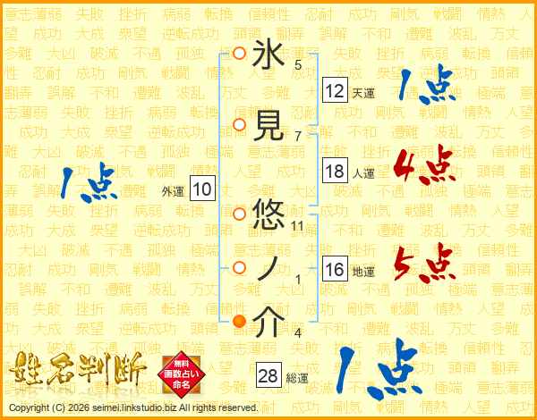 氷(5画)見(7画) 悠(11画)ノ(1画)介(4画)