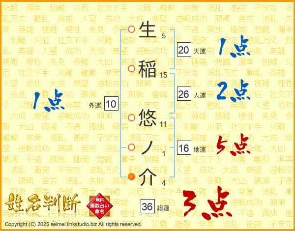生(5画)稲(15画) 悠(11画)ノ(1画)介(4画)