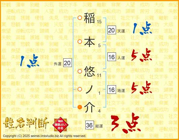 稲(15画)本(5画) 悠(11画)ノ(1画)介(4画)