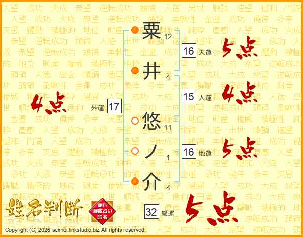 粟井悠ノ介さんの総運は32画の5点!