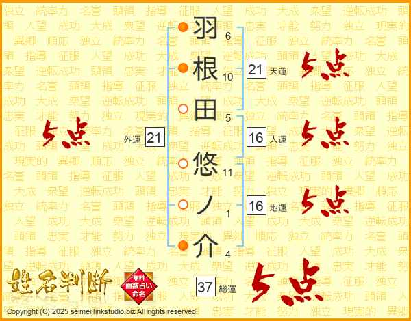 羽根田悠ノ介さんの総運は37画の5点!