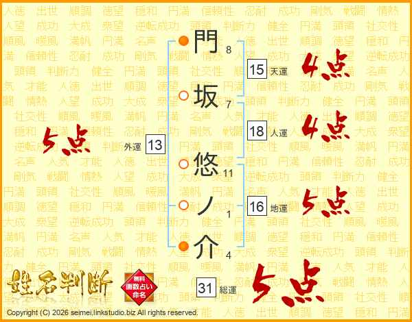 門坂悠ノ介さんの総運は31画の5点!