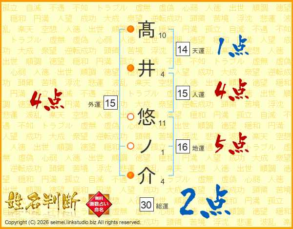 髙(10画)井(4画) 悠(11画)ノ(1画)介(4画)