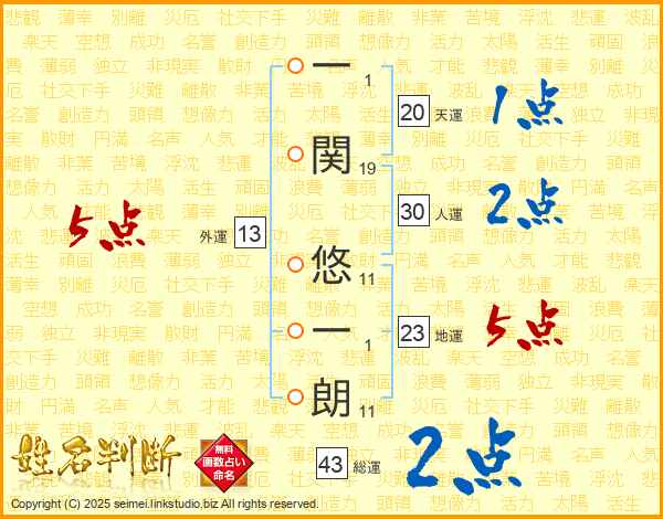 一(1画)関(19画) 悠(11画)一(1画)朗(11画)