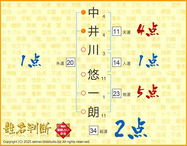 中(4画)井(4画)川(3画) 悠(11画)一(1画)朗(11画)