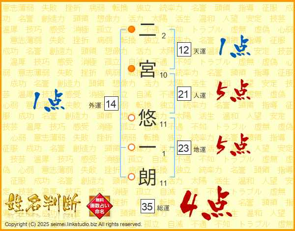 二宮悠一朗さんの人運は21画の5点!