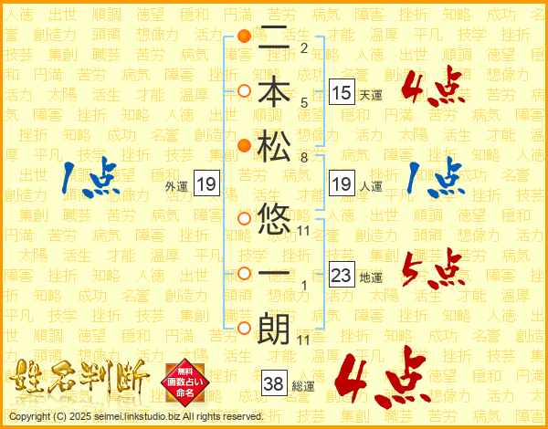 二(2画)本(5画)松(8画) 悠(11画)一(1画)朗(11画)