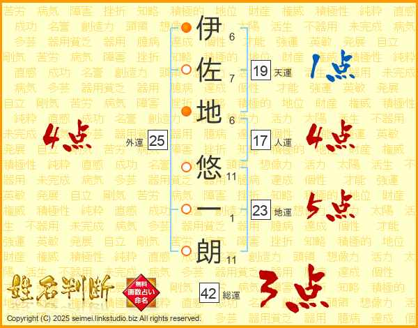 伊(6画)佐(7画)地(6画) 悠(11画)一(1画)朗(11画)