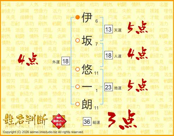 伊(6画)坂(7画) 悠(11画)一(1画)朗(11画)