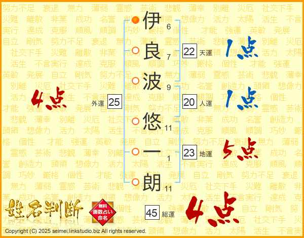伊(6画)良(7画)波(9画) 悠(11画)一(1画)朗(11画)